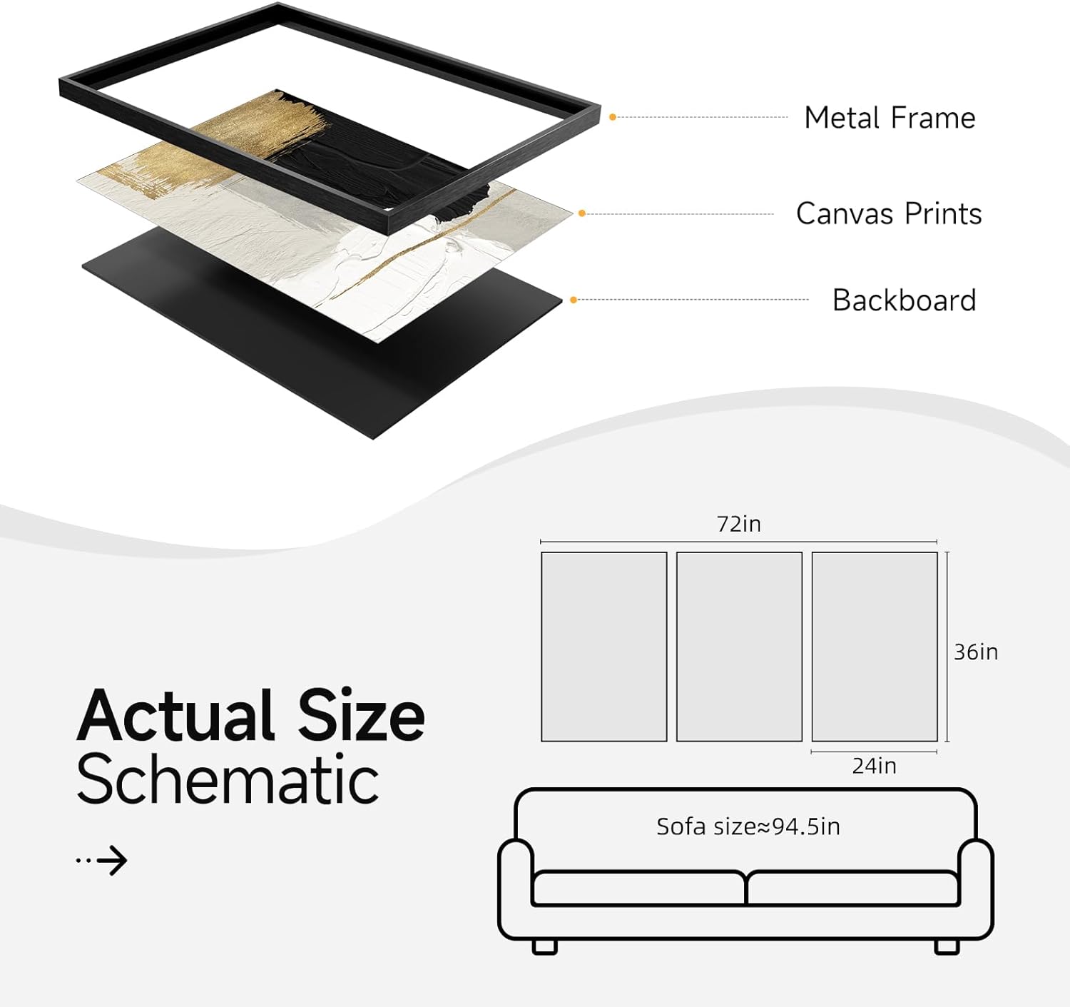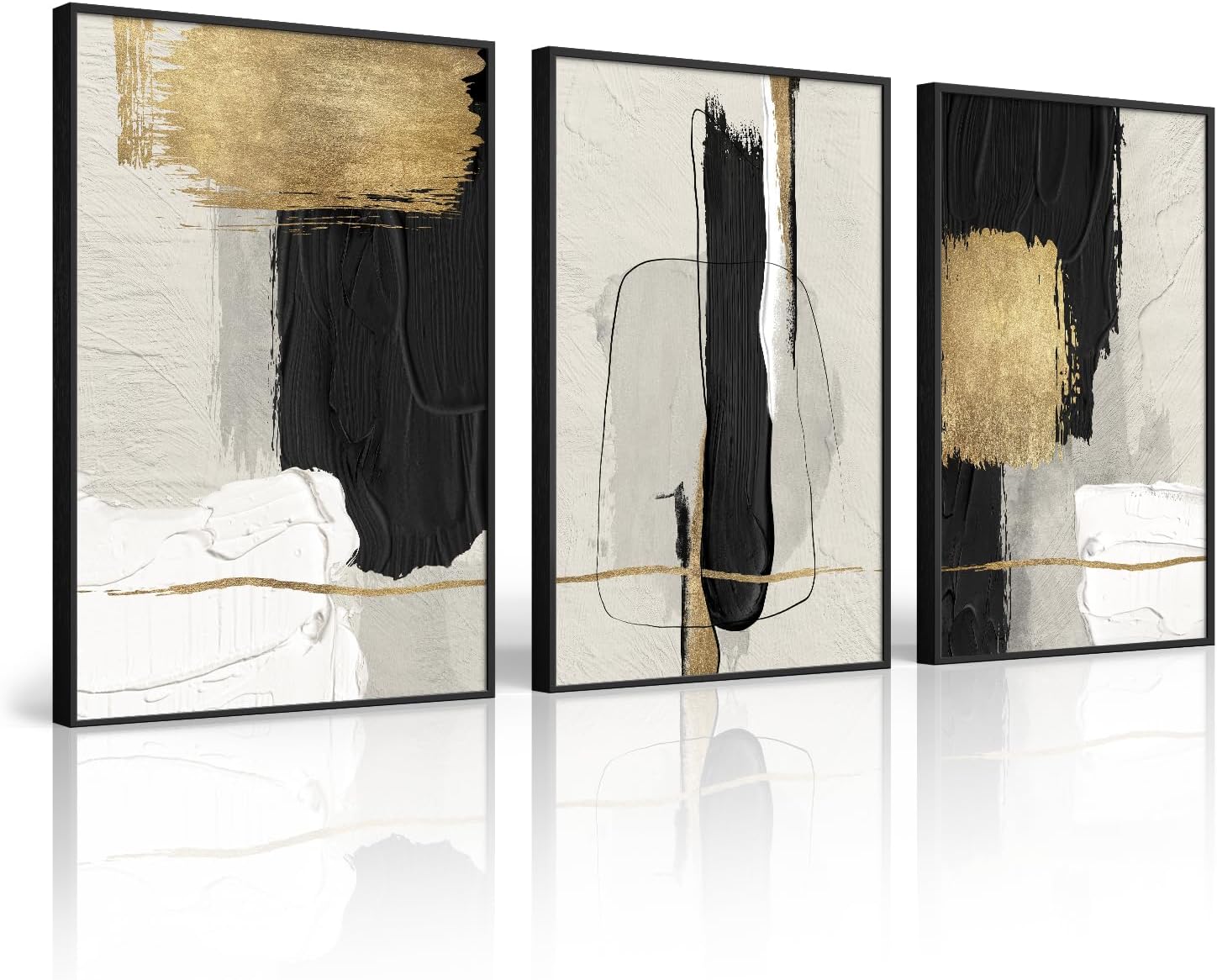 - [Framed Wall art]: A set of 3 large contemporary minimalist black white and gold abstract wall art each 24x36 inches, 3 pieces totaling 36" H x 72" W. The frame is durable, sturdy and the simple and stylish black frame blends perfectly with a variety of decorative styles