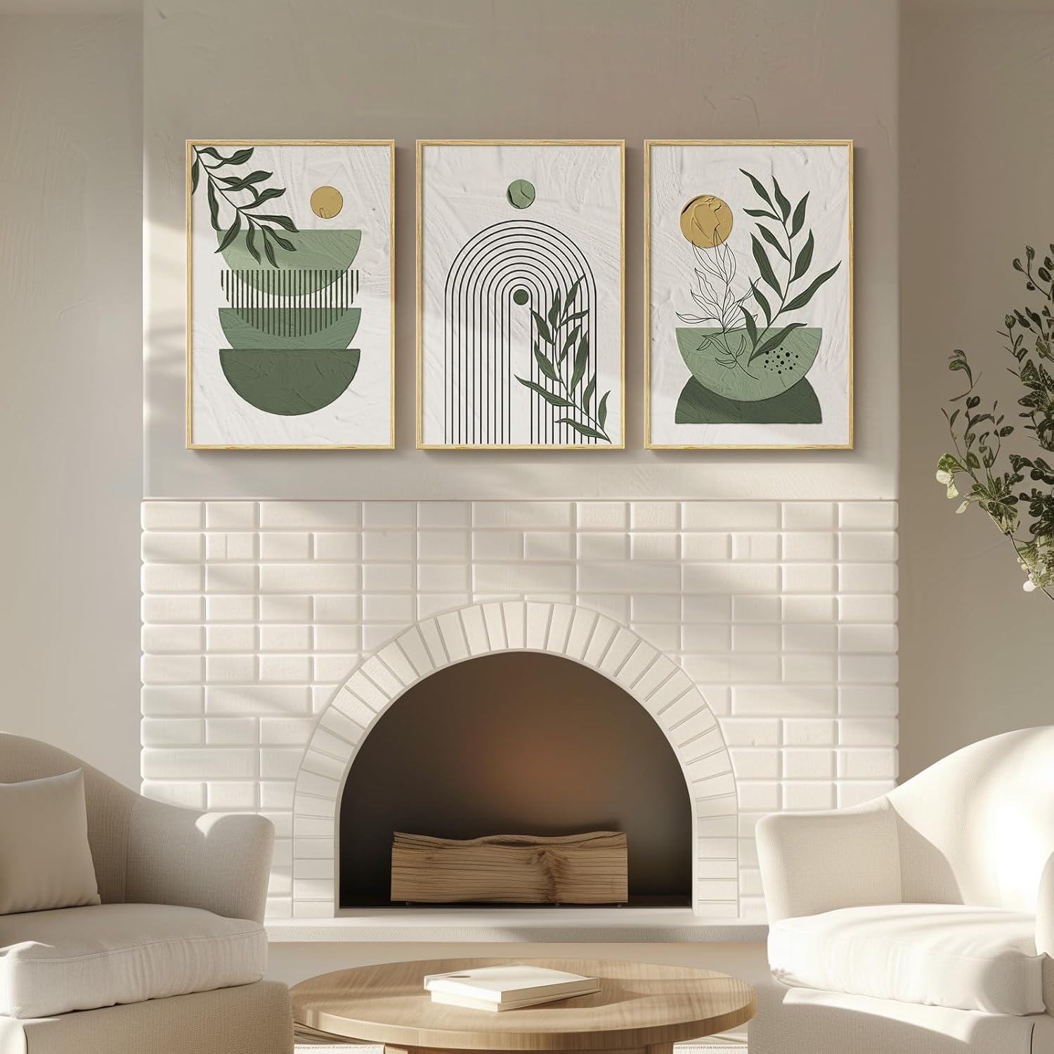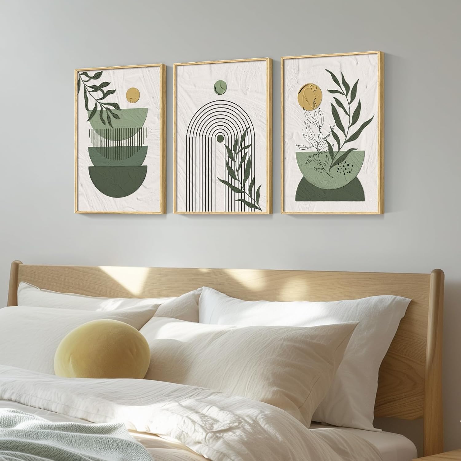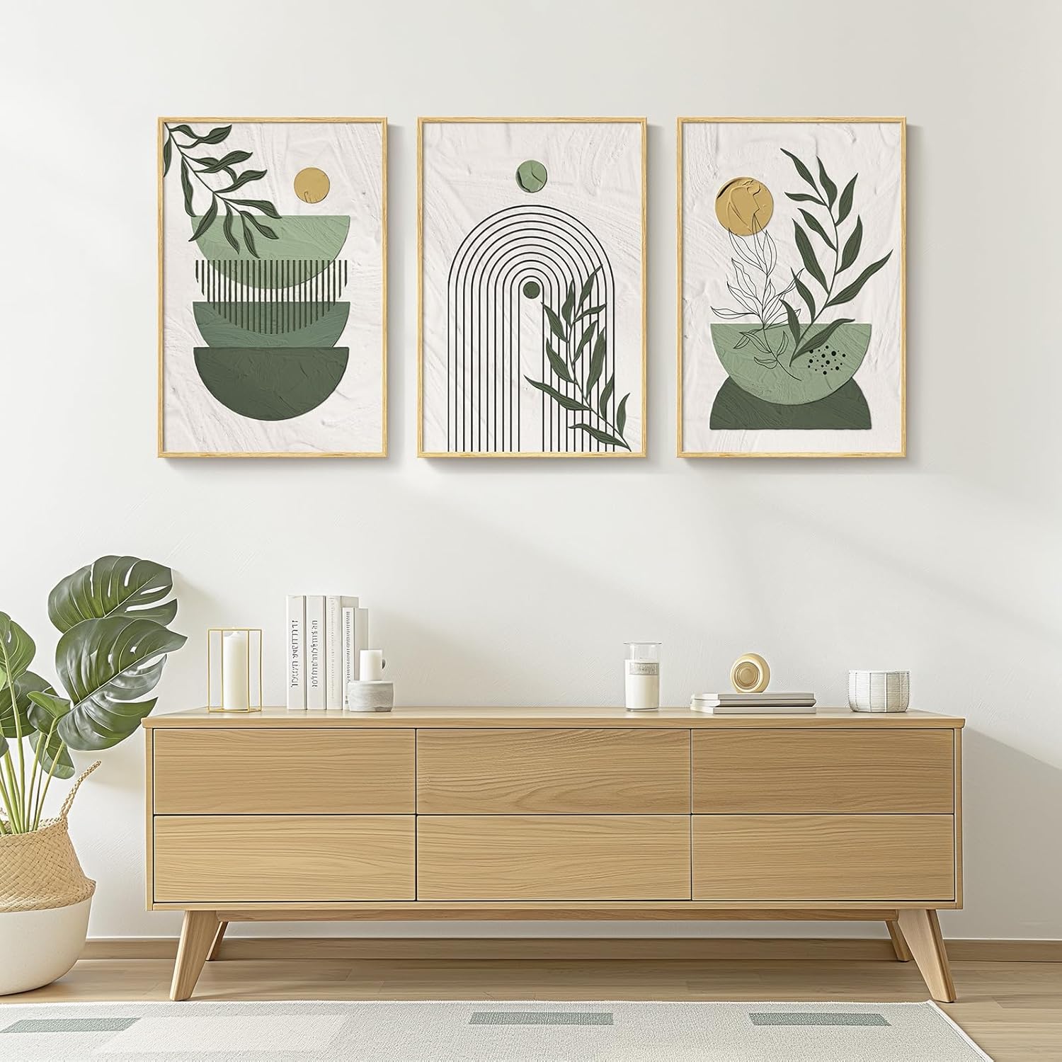 - [As Good As The Picture]: This set of paintings mainly uses natural tones such as green and beige to create a unique visual effect through geometric shapes and plant elements, giving a harmonious and cozy feeling. Perfect for wall decoration in living room, hallway, bedroom, dining room, kitchen, study, office, bathroom, hotel, bar and other scenes.